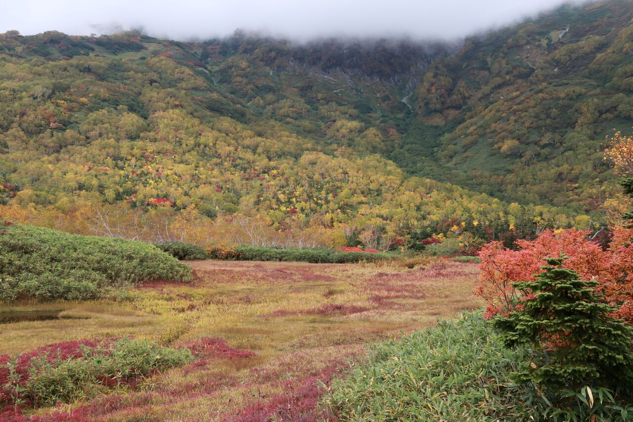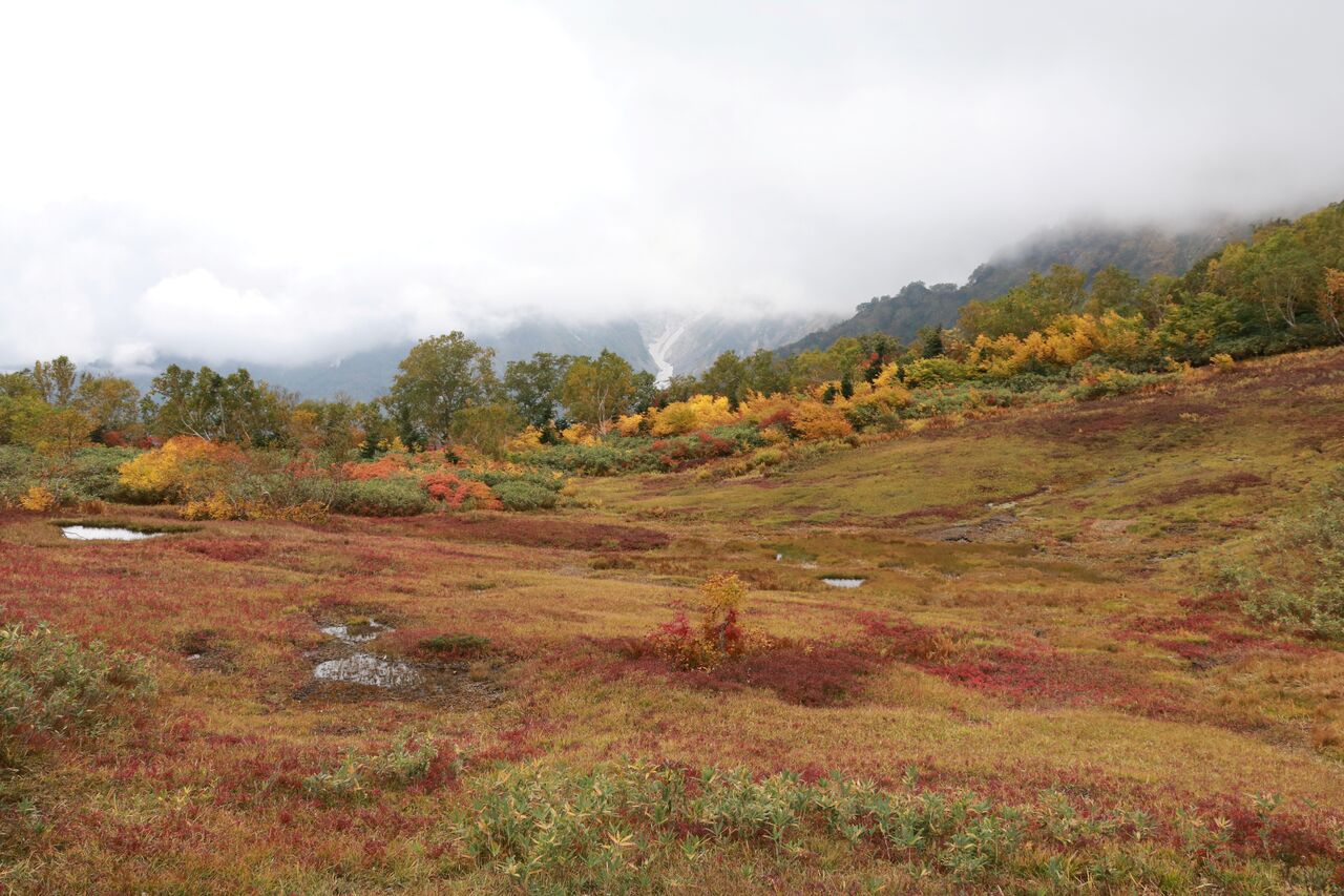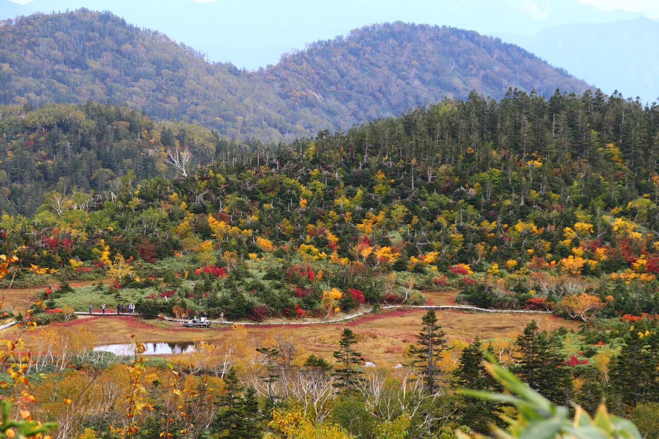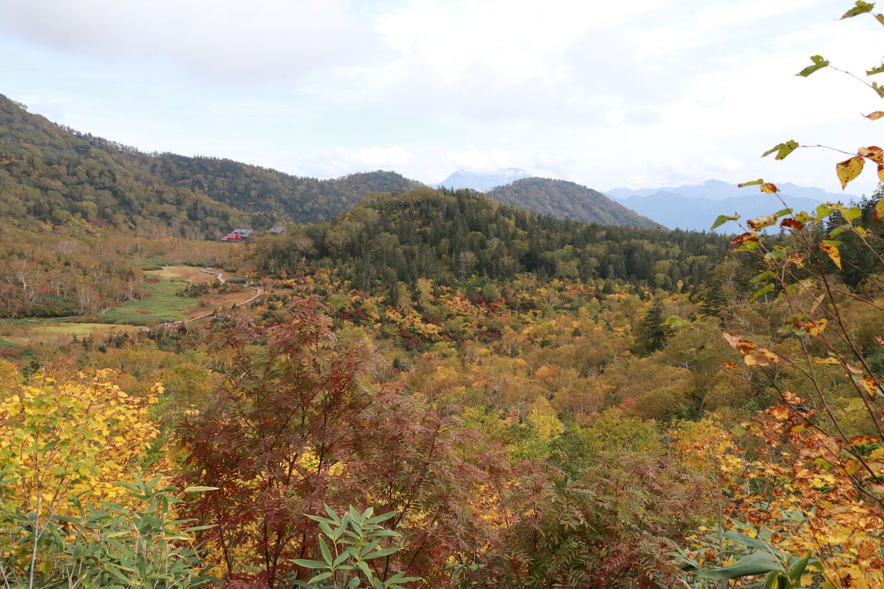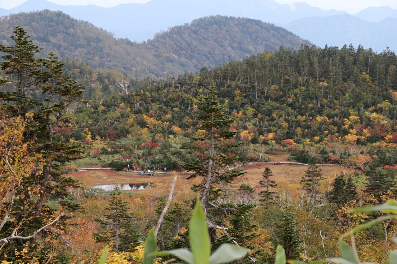 入口からミズバショウ湿原の周りを歩くのですが、当然ミズバショウは跡形もありません。この時期の湿原は草紅葉を楽しみますが、そちらの方はおそらくまだまだかと思います(以前に尾瀬の草紅葉を見たときとの比較でそう思いました)。しかし、周辺の山はパッチワークのようになっています。