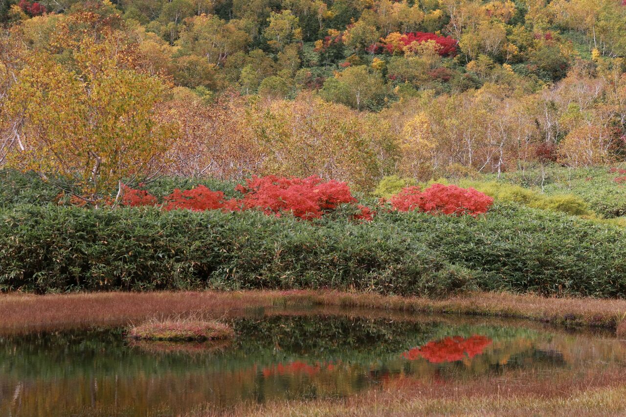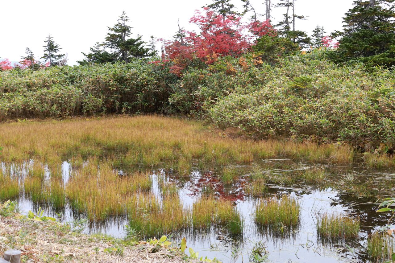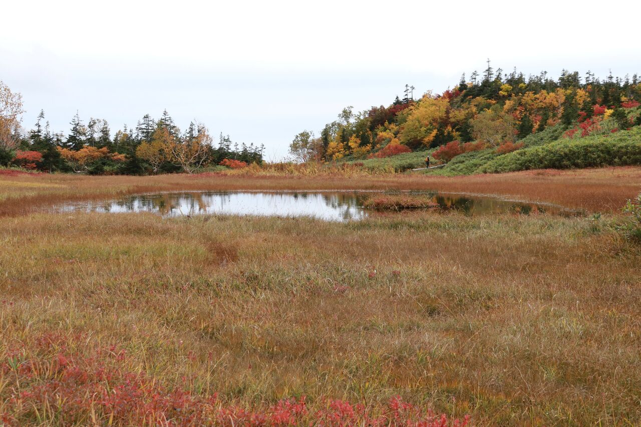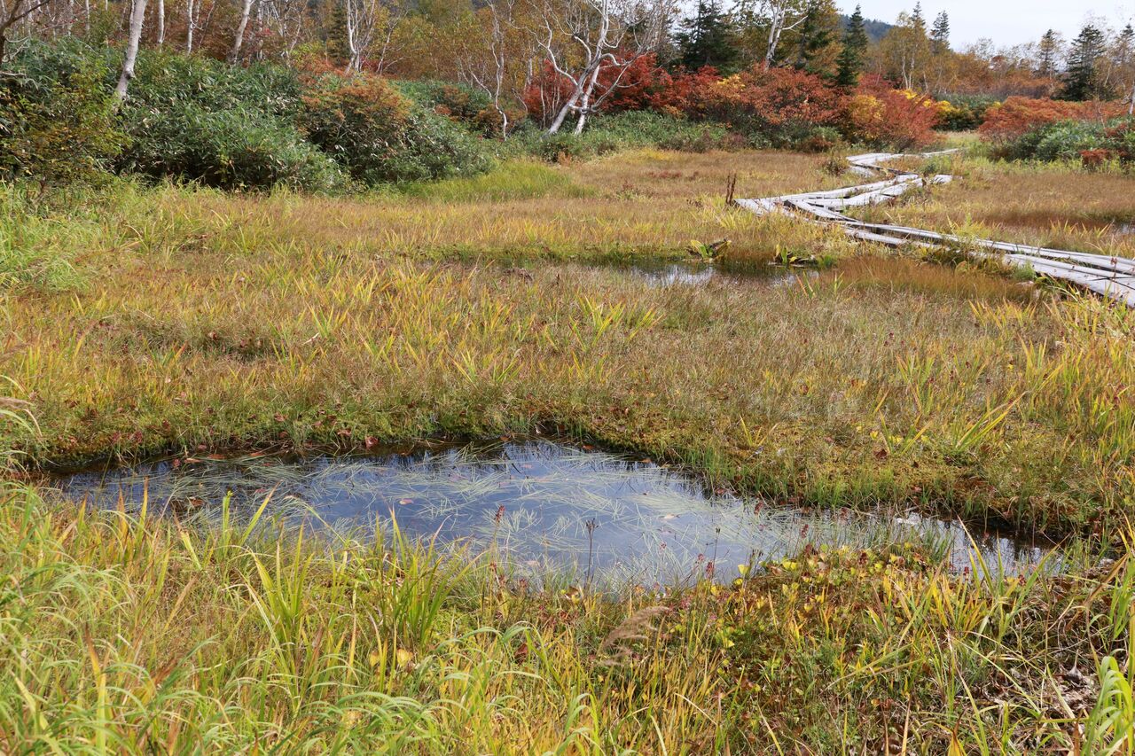 ミズバショウ湿原の先の湿原には池塘が散見されます。