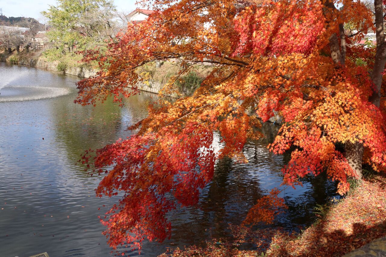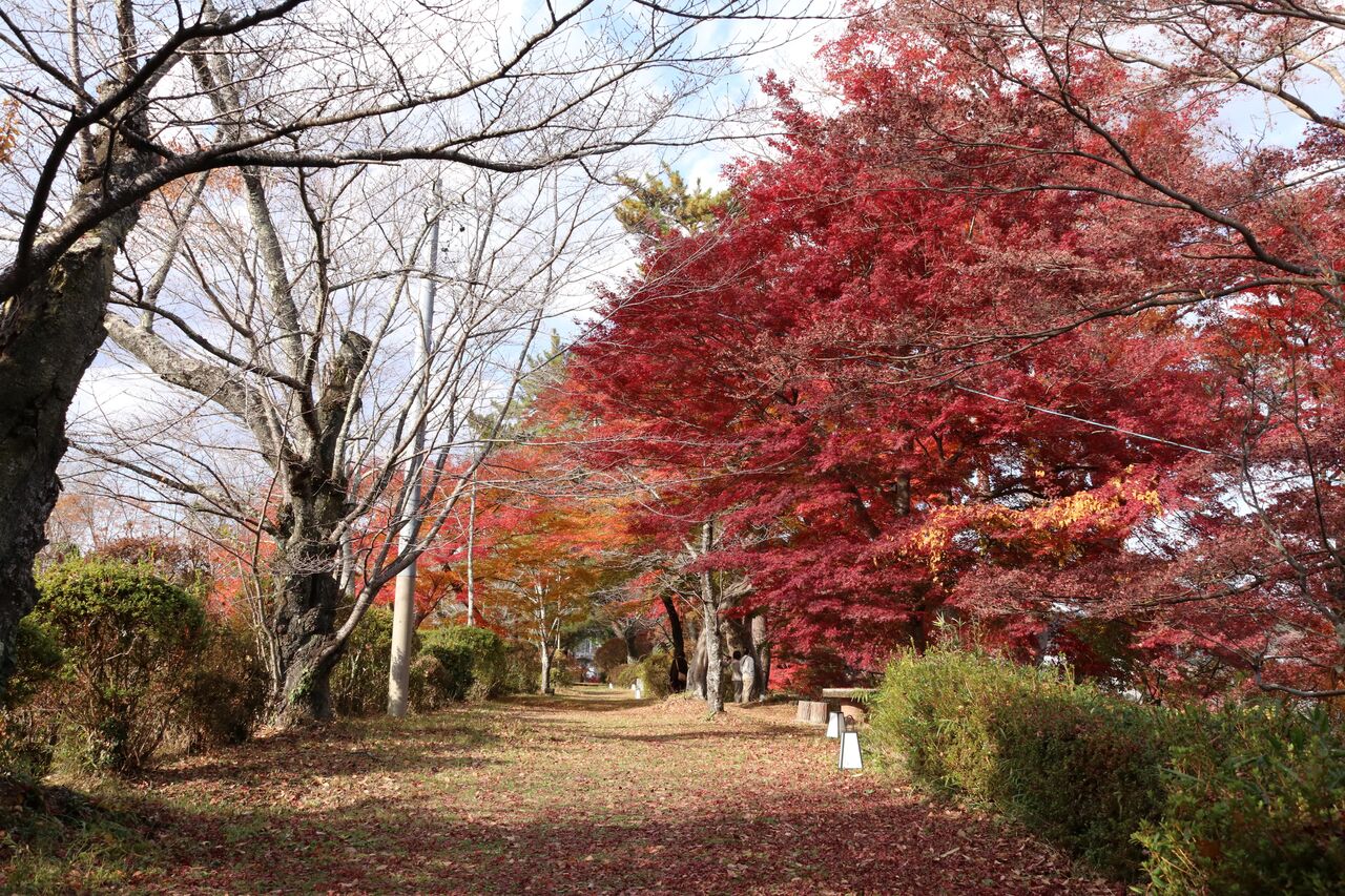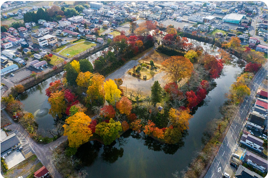 さて、「ふくしまの旅」というサイトに、この公園を上空から撮った写真がありましたが、紅葉がとてもきれいです。こちらです。