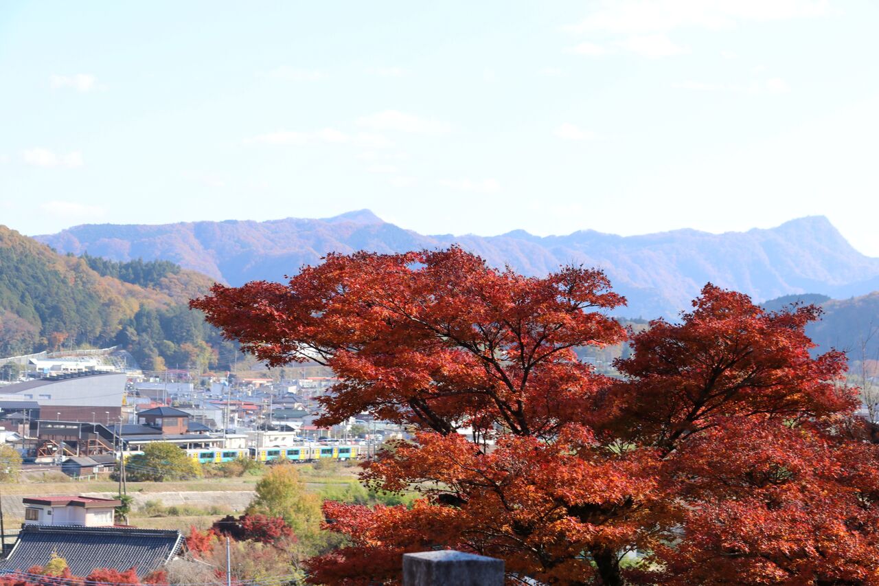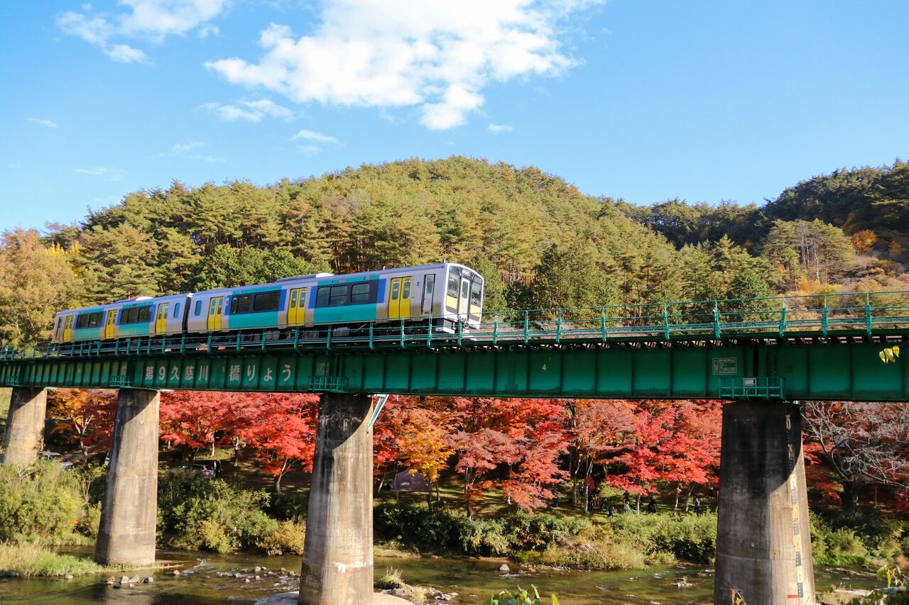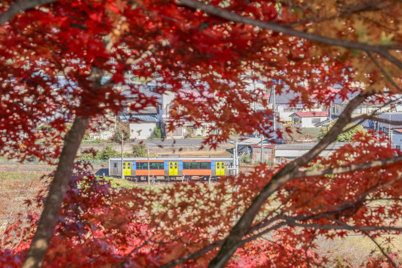 紅葉の間からは水郡線の車両も見えます。