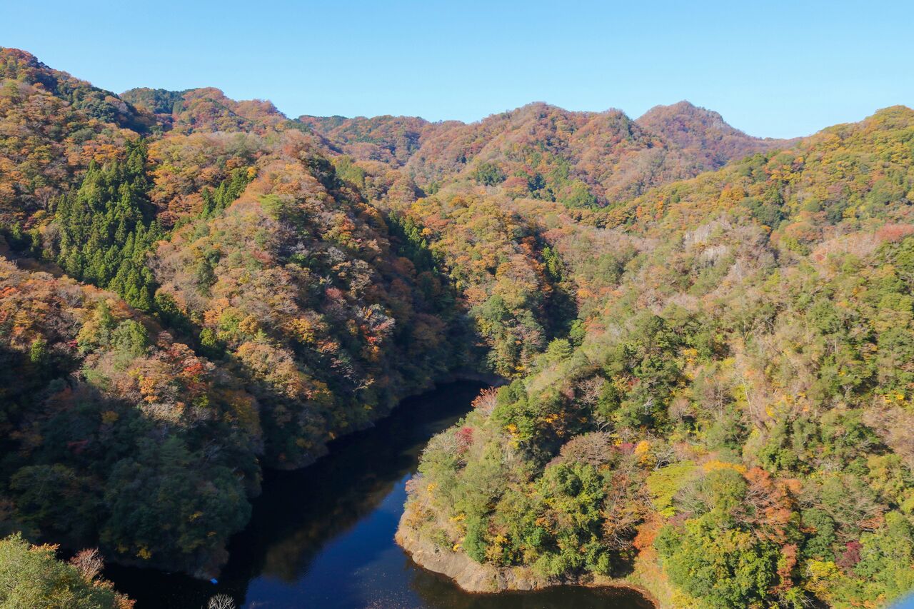 今回立ち寄ったのは、まず、常陸太田市の竜神峡に架かる「竜神大吊橋」。昔は日本一の長さを誇ったらしいですが、今は第3位となっているようです。遅くなったことで、駐車場待ちにも時間が取られるかと心配でしたが、その心配は無用でした。