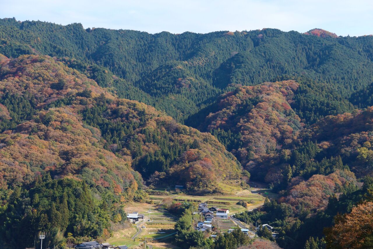 山門前から後ろを振り返ると八溝山(ヤミゾサン)が望めます。