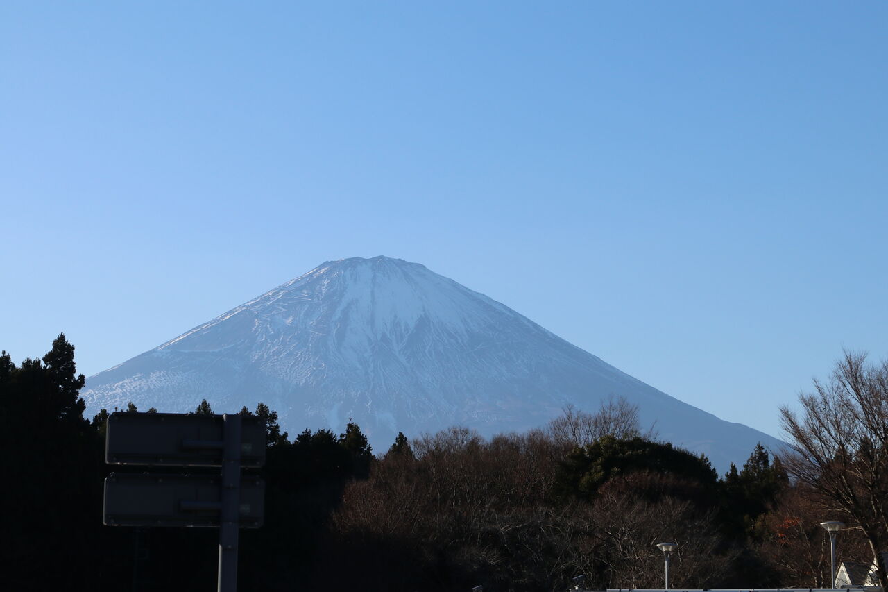 先日、世田谷から見る富士山の東斜面はしっかり雪化粧しているのに、身延山から見る北西斜面は雪が少なく黒い地肌が見えていると書きました。しかし、今日見た富士山も黒い地肌が見えていました。東名の足柄SAから撮った写真です。