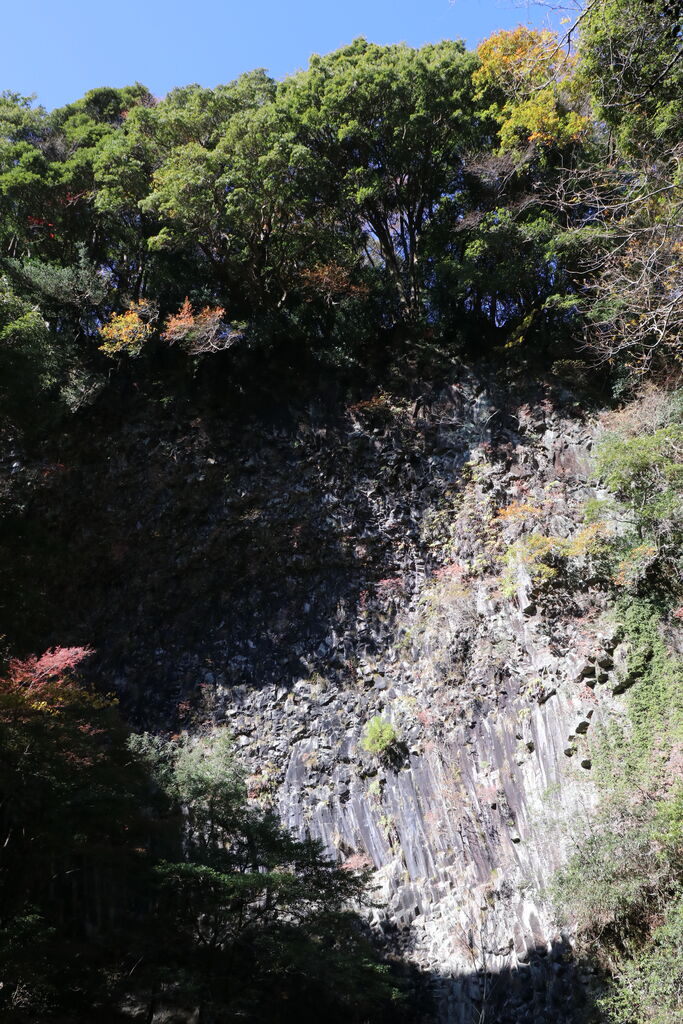 滝の横の岩が蛇のうろこのようです。これも柱状節理です。