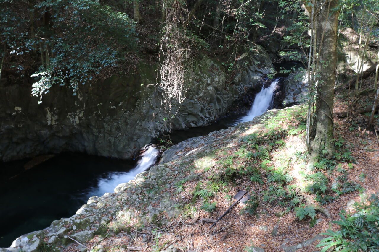この滝壺に、もう一つ荻ノ入川から落ちてくる滝があります。これが出合滝です。