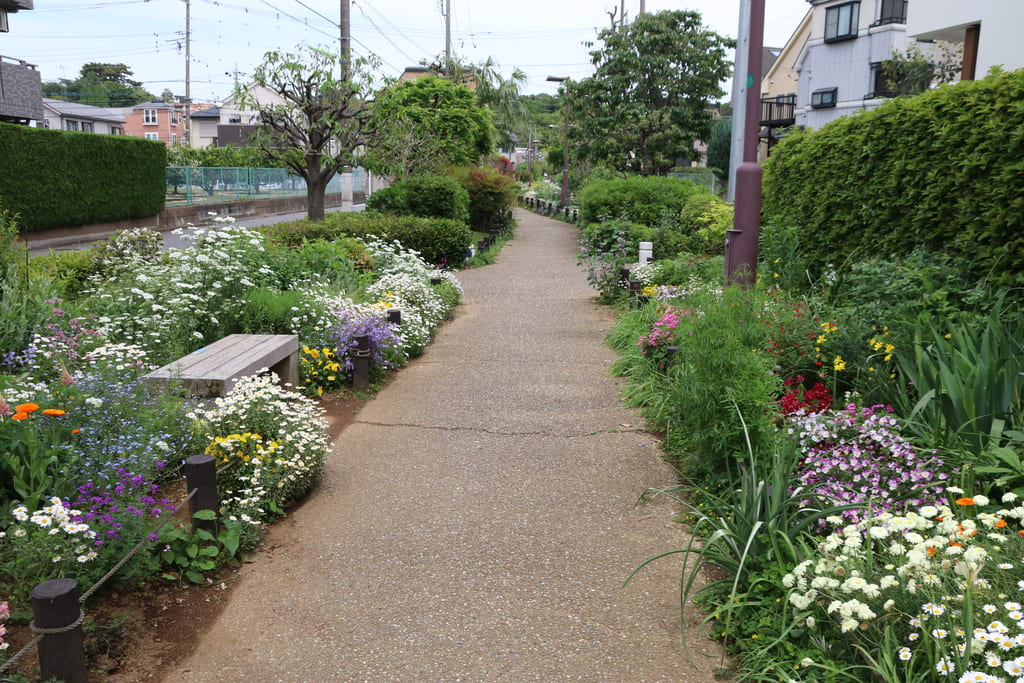 この辺の遊歩道は、堤防の上でなく下に作られています。下とは言っても、川よりは一段高くなっています。