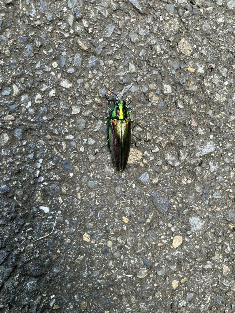 道を歩いていると、道路に玉虫が・・・。