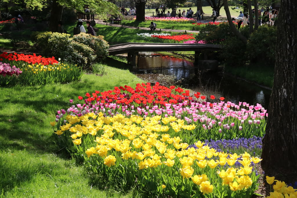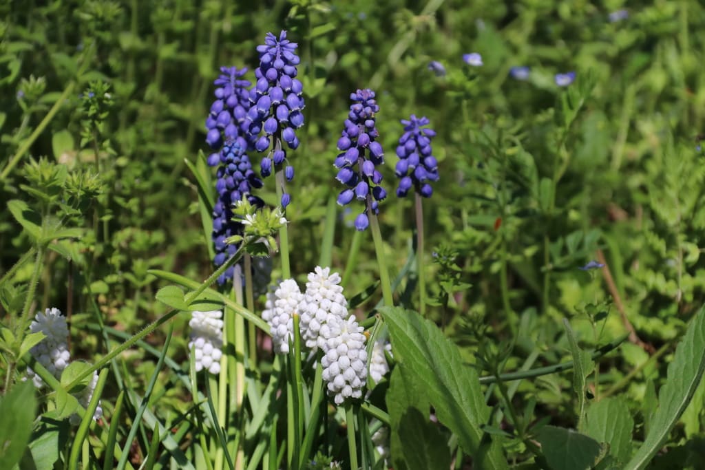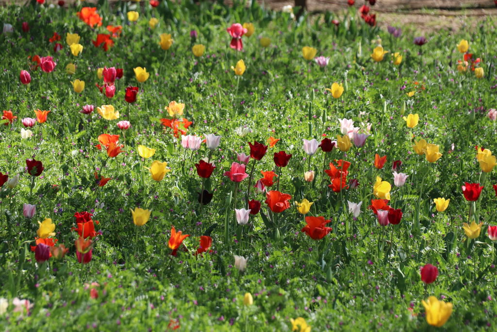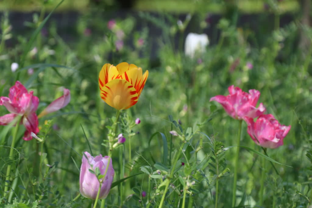 木道の周りの野原には、チューリップやムスカリ、水仙などが咲いていました。