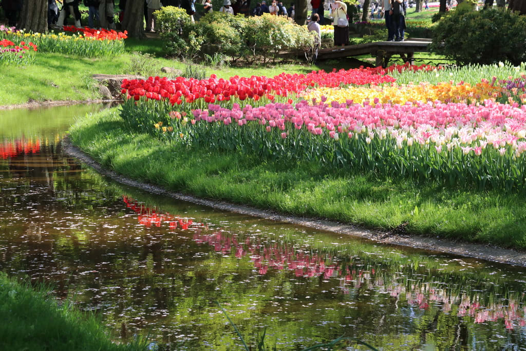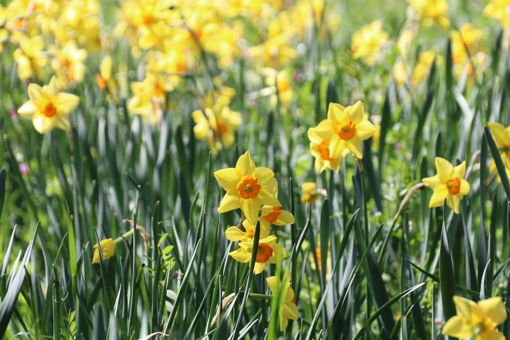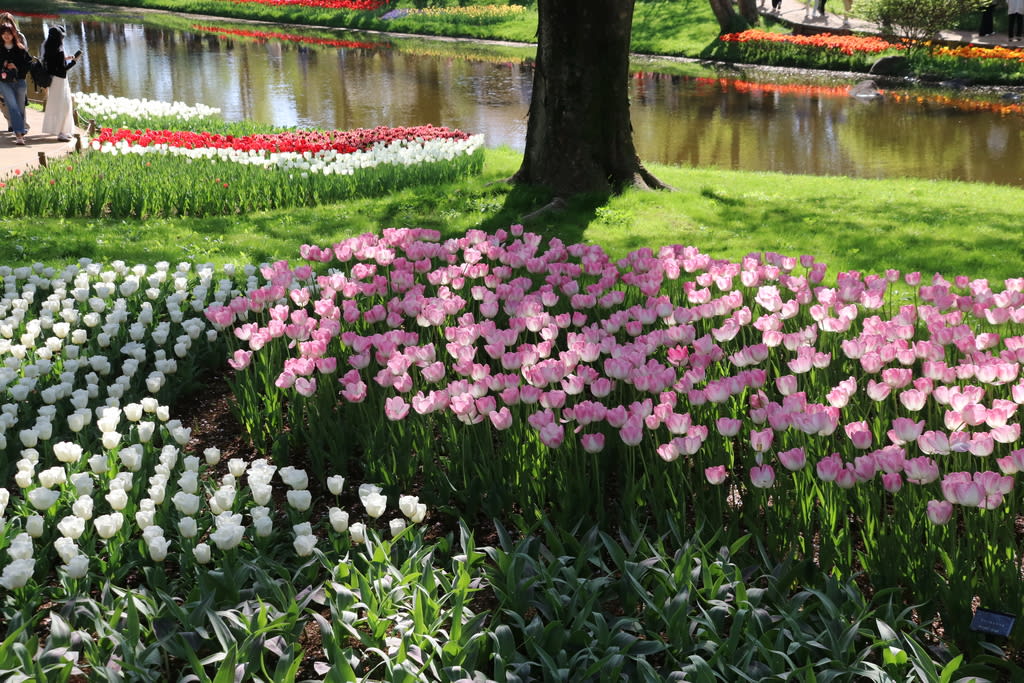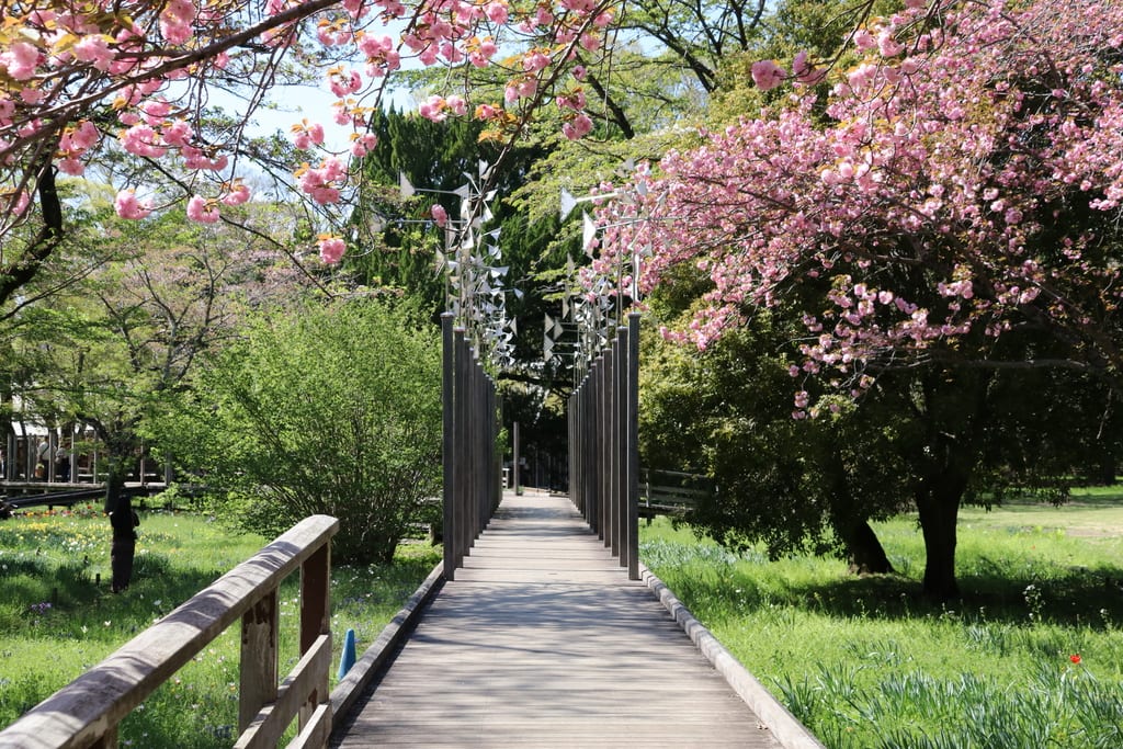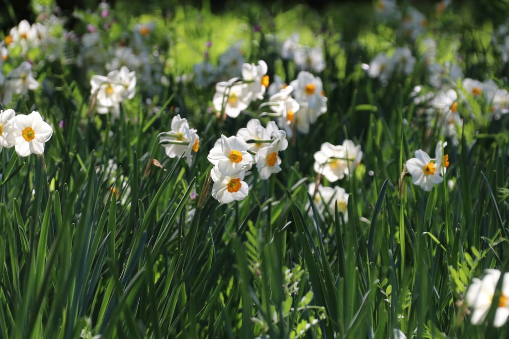 木道の周りの野原には、チューリップやムスカリ、水仙などが咲いていました。