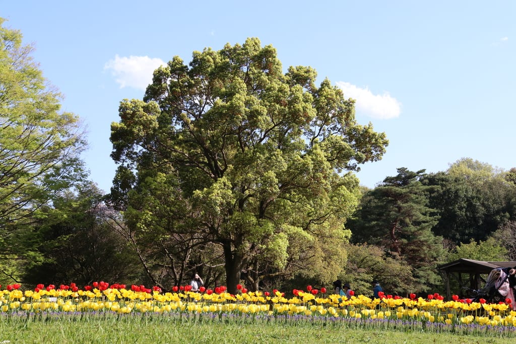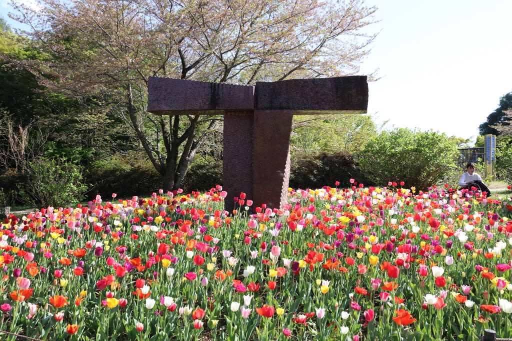 帰ろうと出口に向かいます。行きでは素通りしましたが、T字型のオブジェがある花壇のチューリップも撮りました。