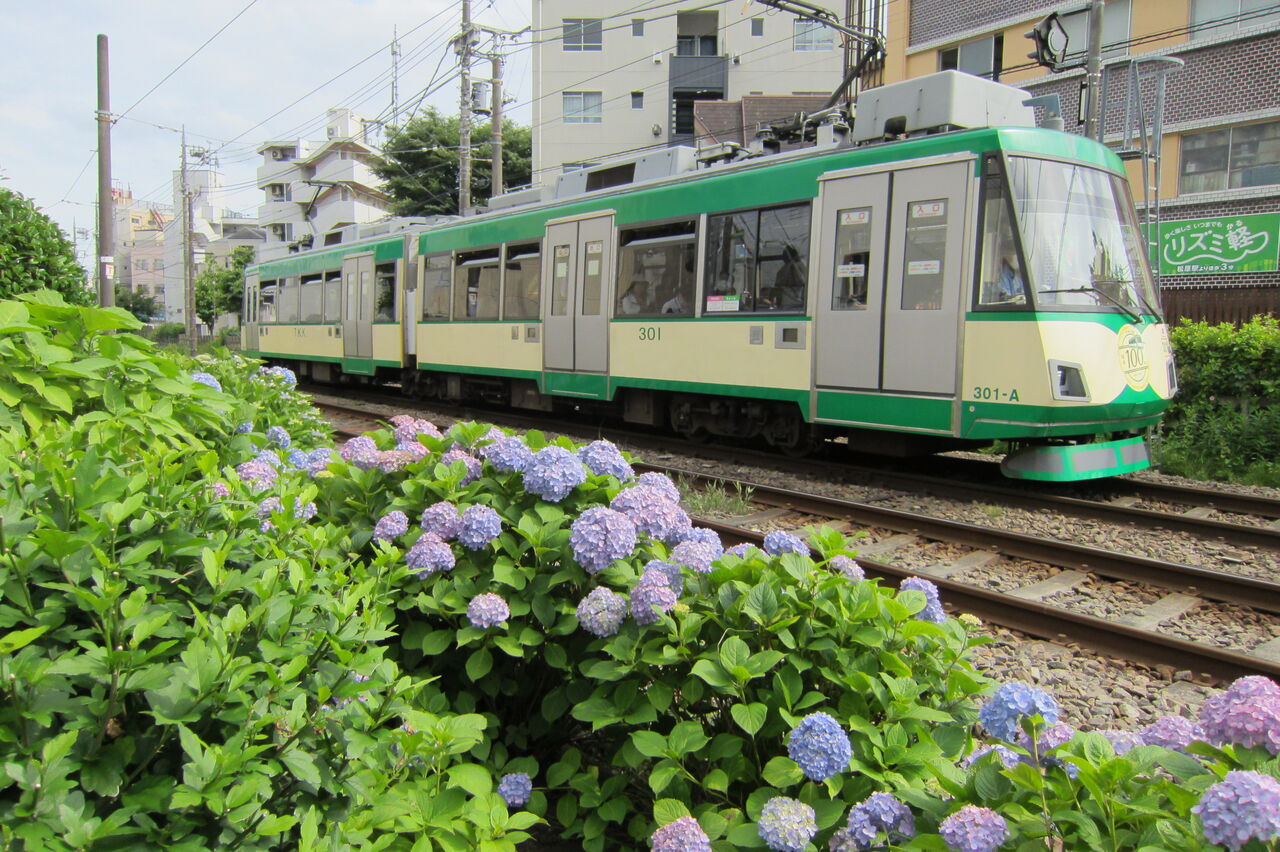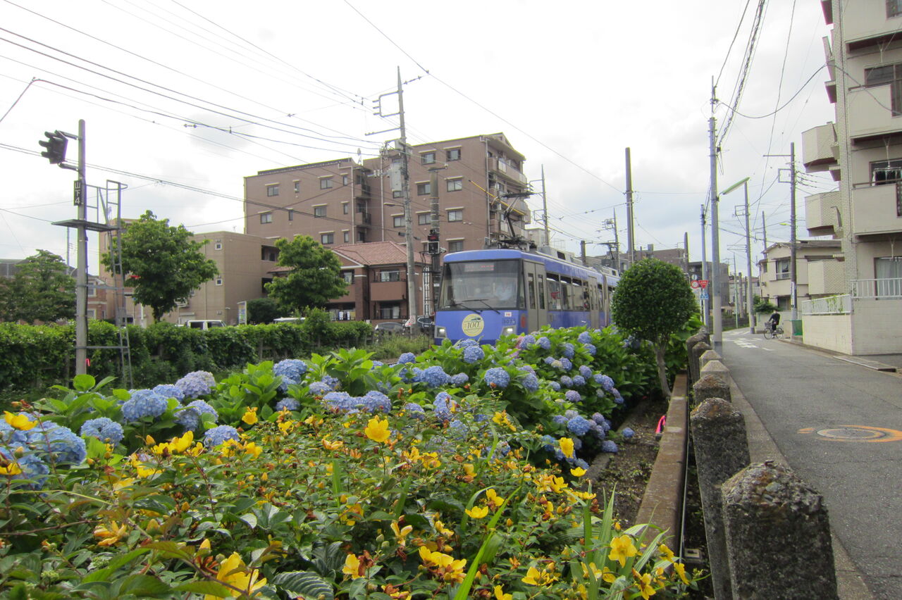 世田谷線の線路わきには、ところどころアジサイが植えられ、今見ごろを迎えていました。