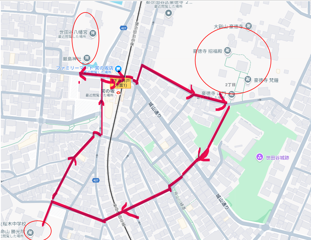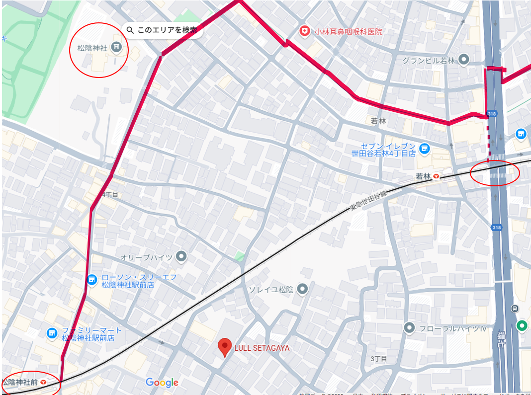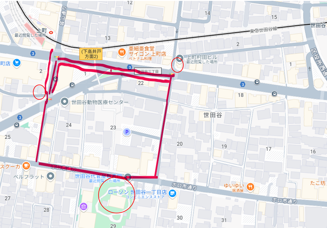 地図にある大きな道路は環七。ここにある世田谷線の若林踏切には遮断機がなく、信号機で車の往来を制御しています。昔は電車も信号機が赤信号で止められていましたが、今は電車の接近で信号が反応し、電車の方は徐行で通過できるようです(未確認ですが、見た感じそうでした)