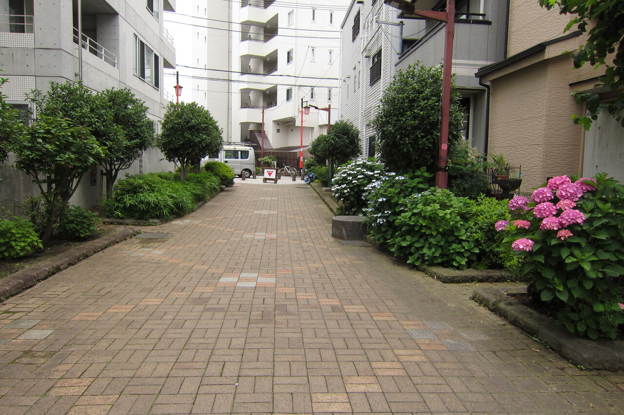 環七を渡ってからは、烏川緑道を歩きます。烏川の暗渠です。左右に花が植えられ癒される散歩道です。