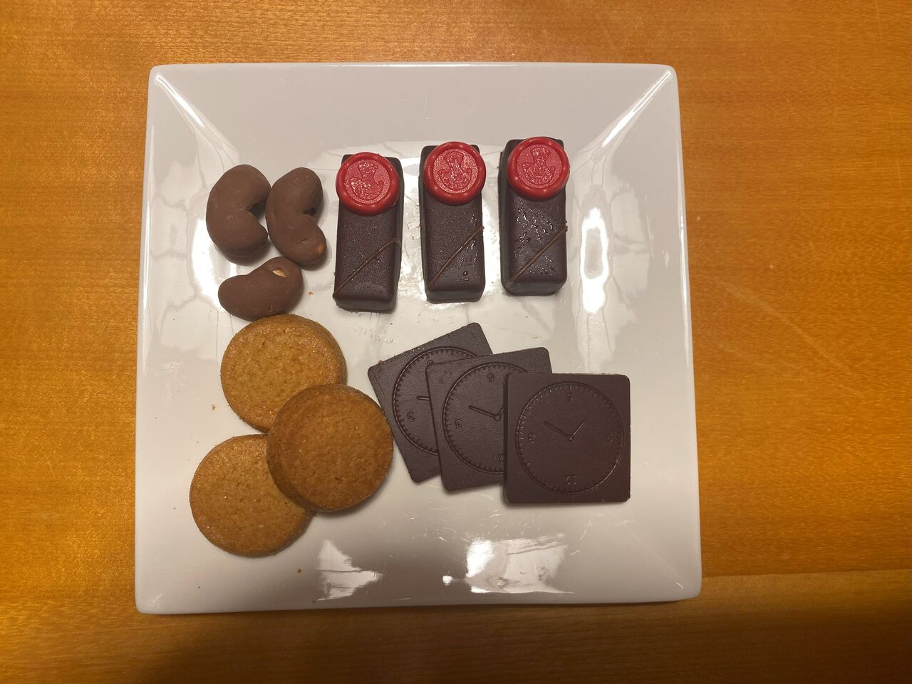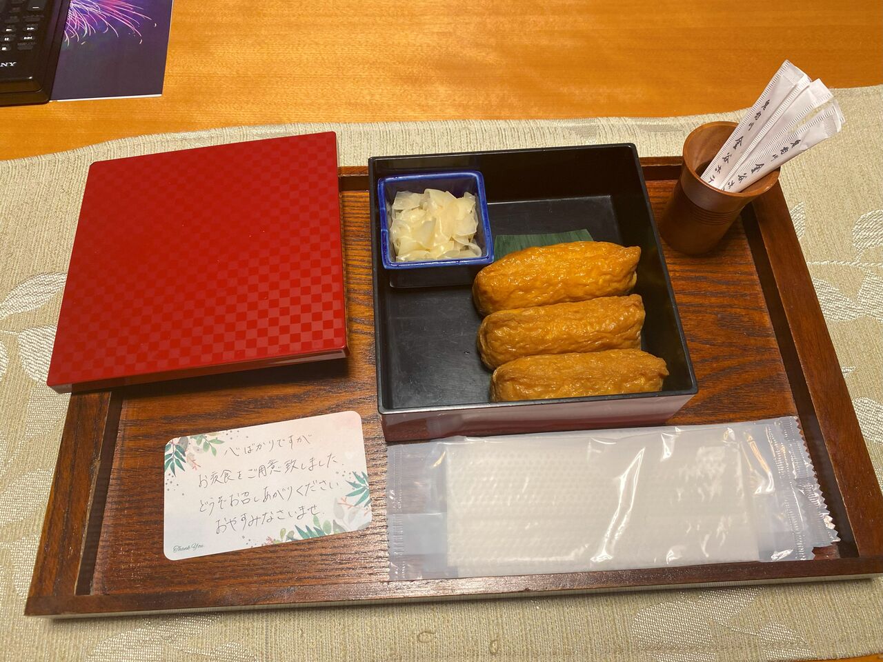 夕食の後、部屋に戻ると、夜食としてお稲荷さんとチョコレートが置かれていました。太ります。