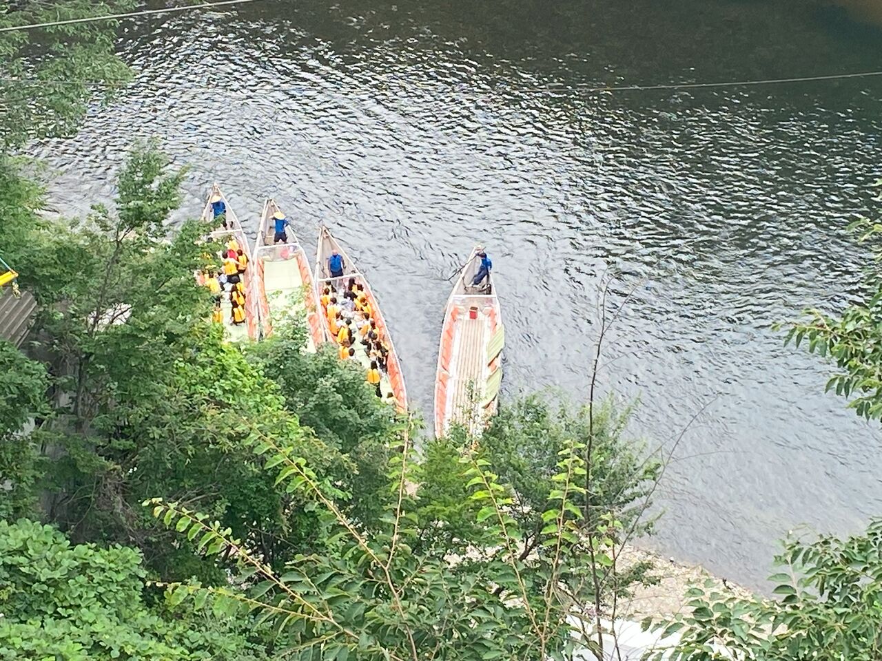さて、後半は川の流れが緩やかになると書きましたが、最後の方は、船頭さんが漕ぐのもつらいほど緩やかになるので、船外機付きのボートに舟4層を縦につないで引っ張っていました。