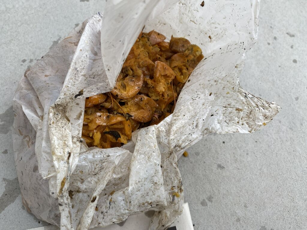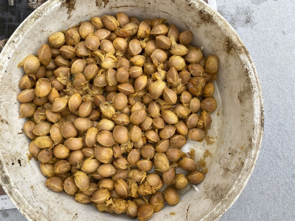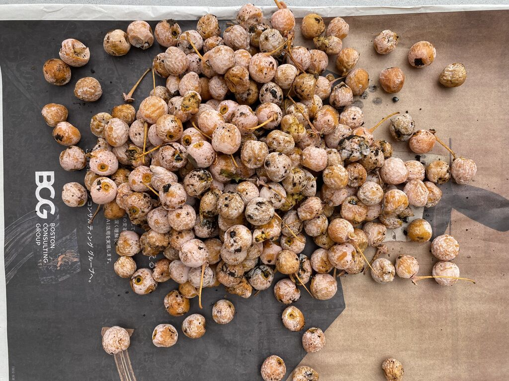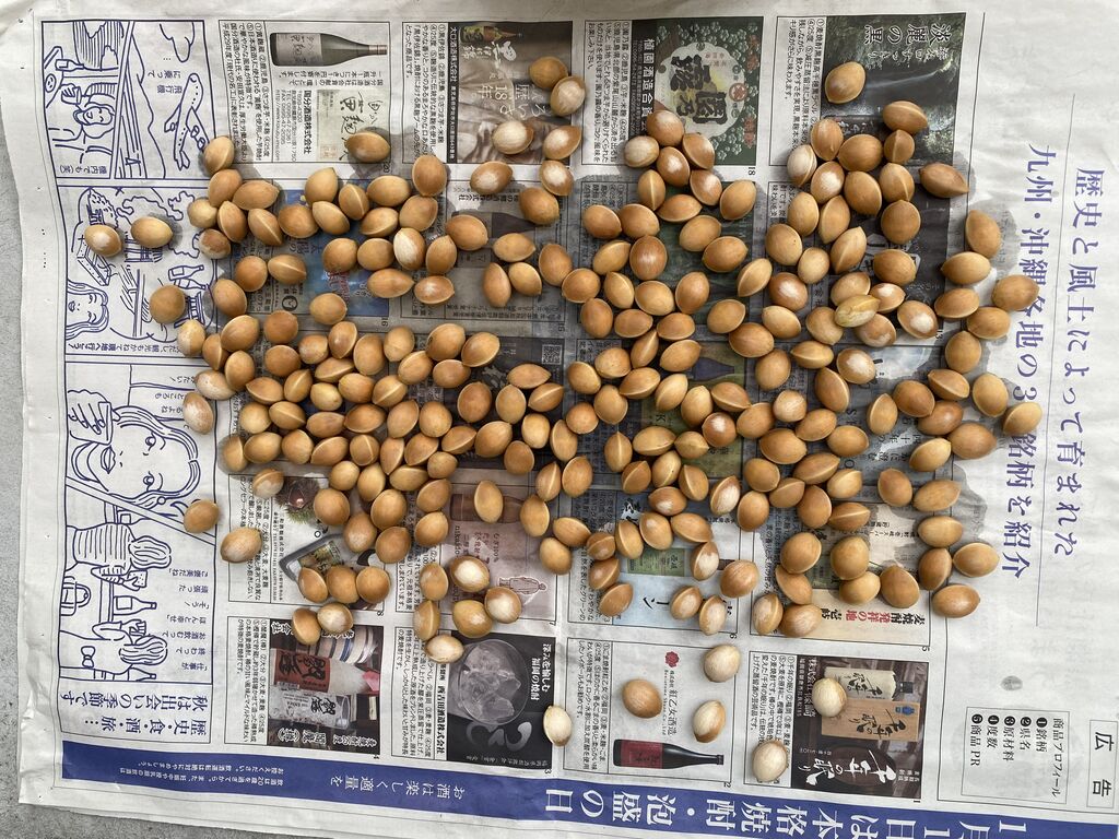 多くの人は、拾う時に果肉の部分を取って捨て、中の種だけ持って帰るようです。元々、自然にここに落ちているものですからそれでいいのでしょうが、私は何だかごみを捨てるような気がして、とりあえず果肉ごと拾って、家で全て処理します。