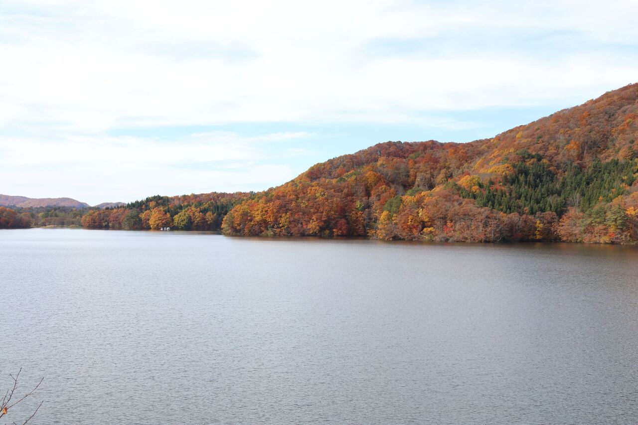 五色沼にすぐ近くにあるのは、三湖の中で最も大きい檜原湖です。とりあえず、五色沼から徒歩で行けますので、まずは檜原湖を観光。昨日のブログの最後にも写真を載せましたが、map①からの風景です。昨日の写真は北方面を撮ったものでした。下の写真は同じ場所から西側の沿岸を撮りました。