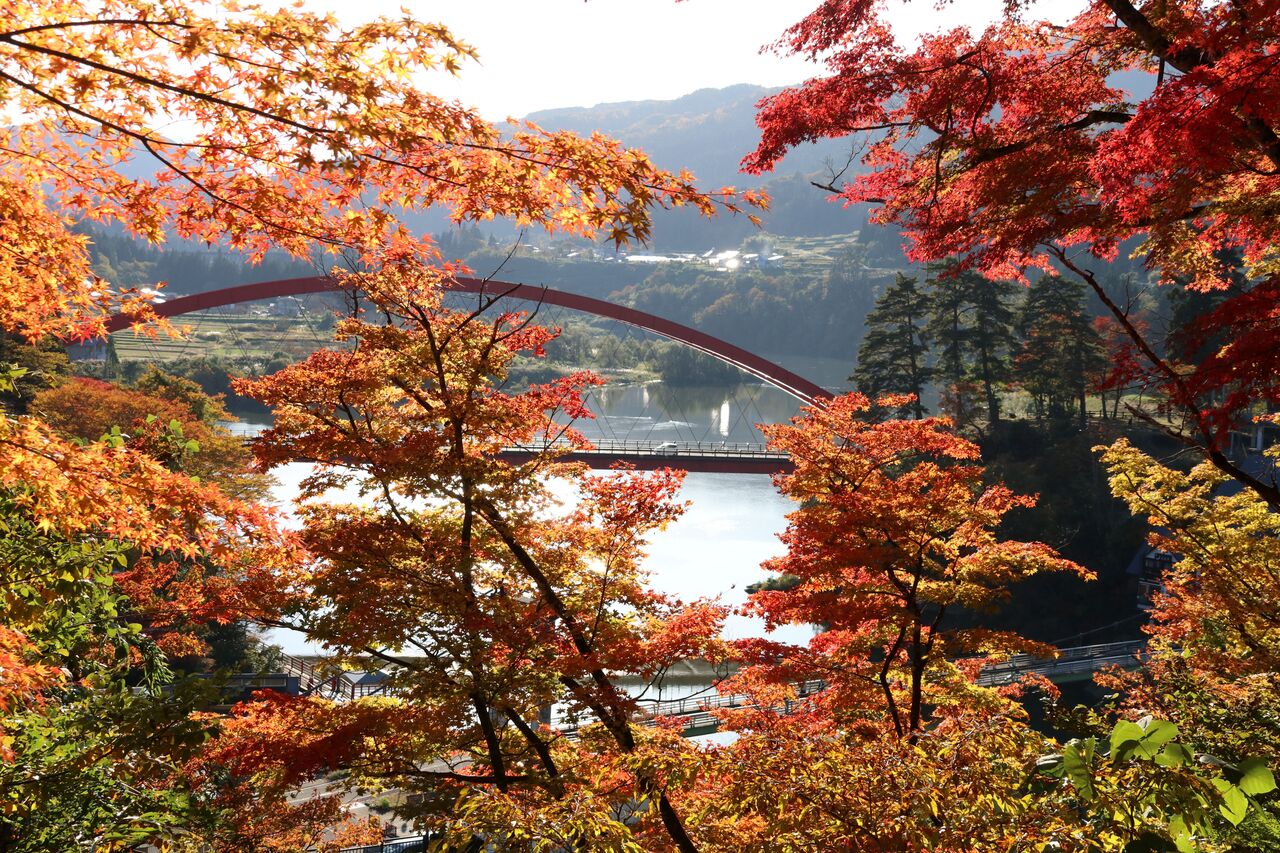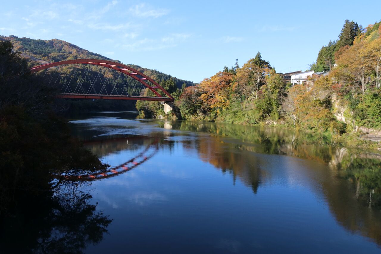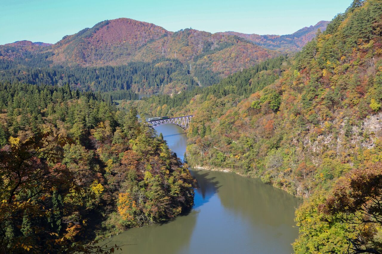 その只見線の撮影ポイントは、只見川にかかる第一只見川橋梁を見下ろす場所、「道の駅 尾瀬街道みしま宿」から歩いてすぐの地点です。紅葉はもう少し後の方が良かったかもです。