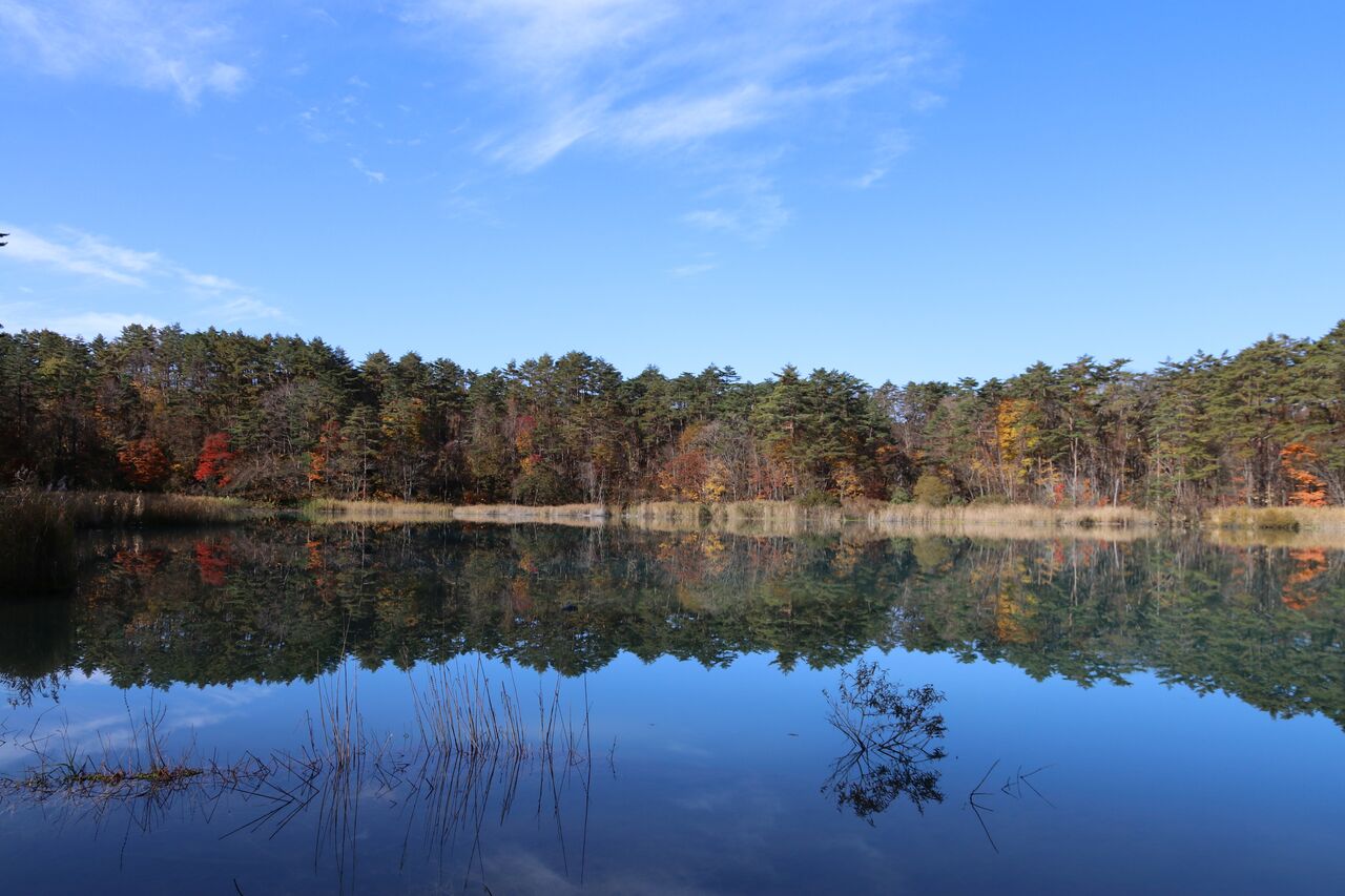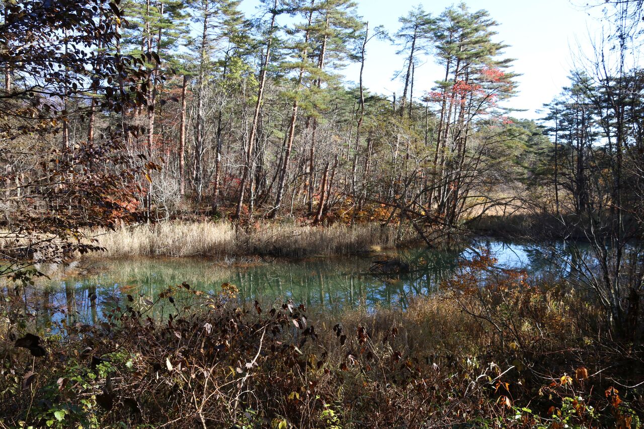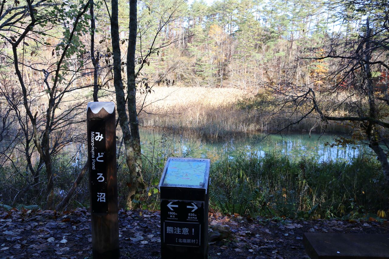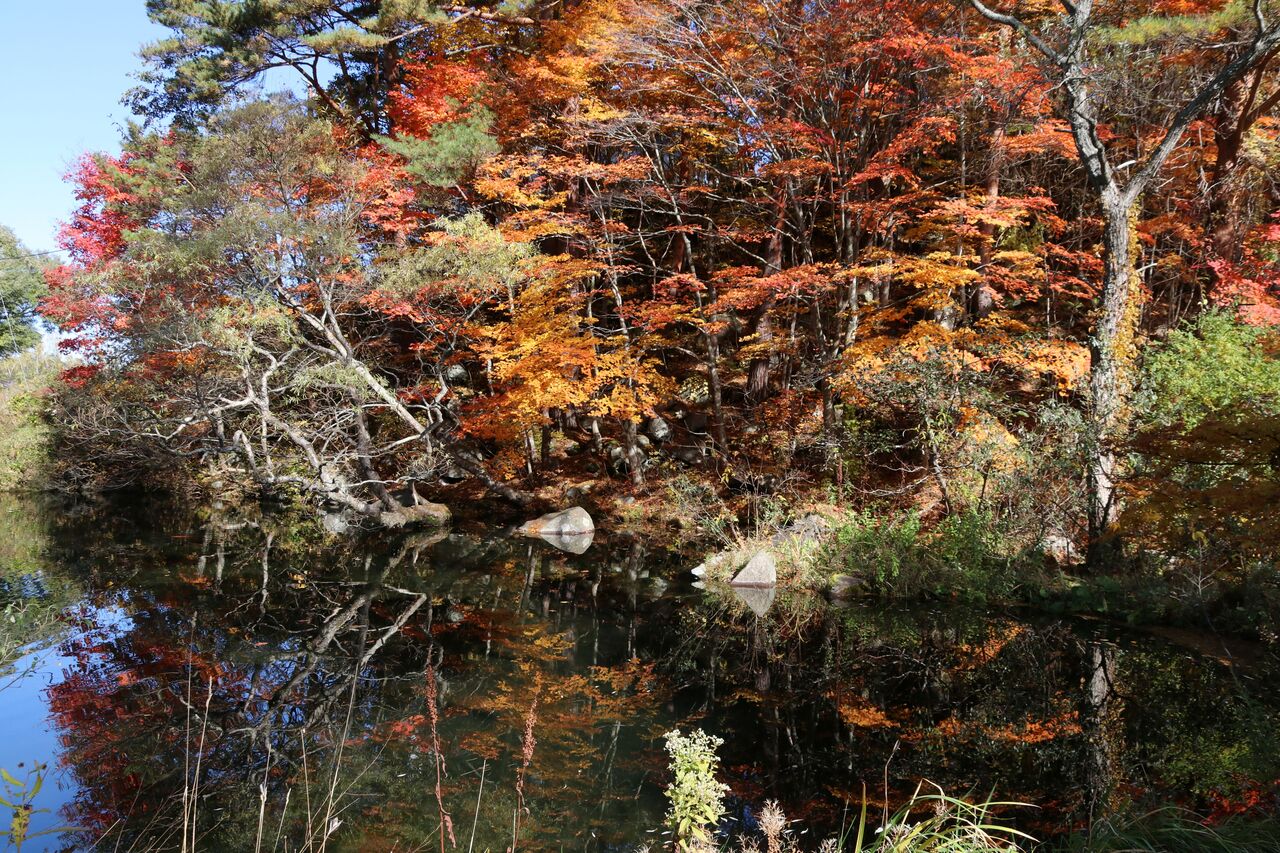 柳沼と探勝路を挟んで反対側には母沼があります。何故か、探勝路のマップには出ていませんでした。木に邪魔されてあまりよく沼は見えませんが、紅葉と共にきれいな水面が垣間見えました。