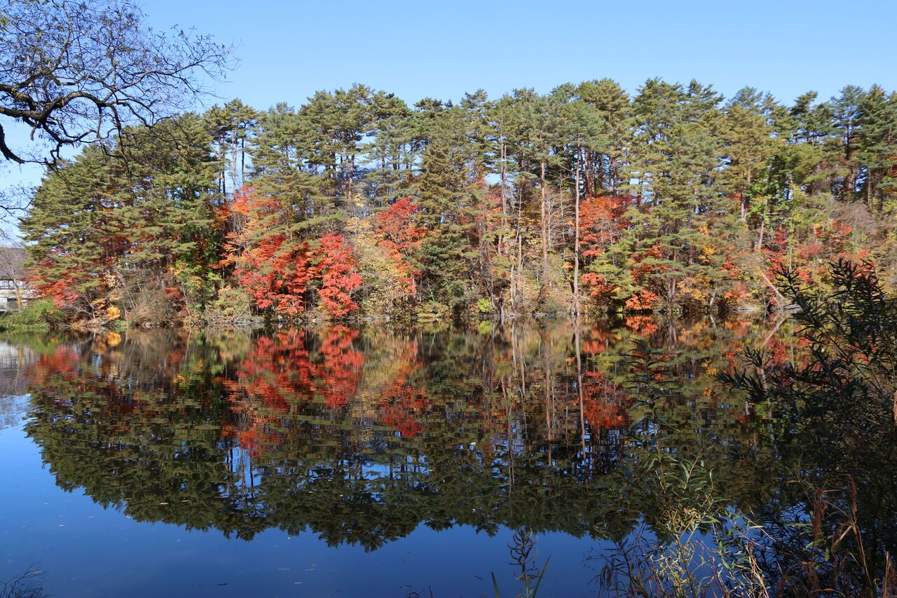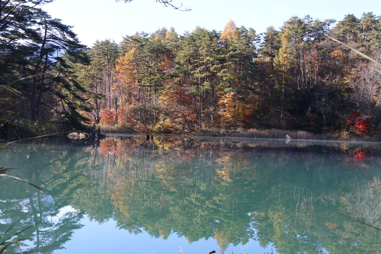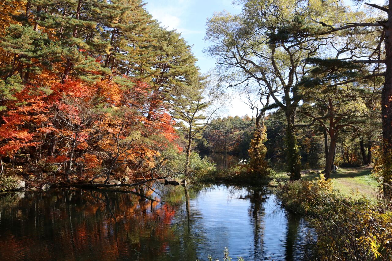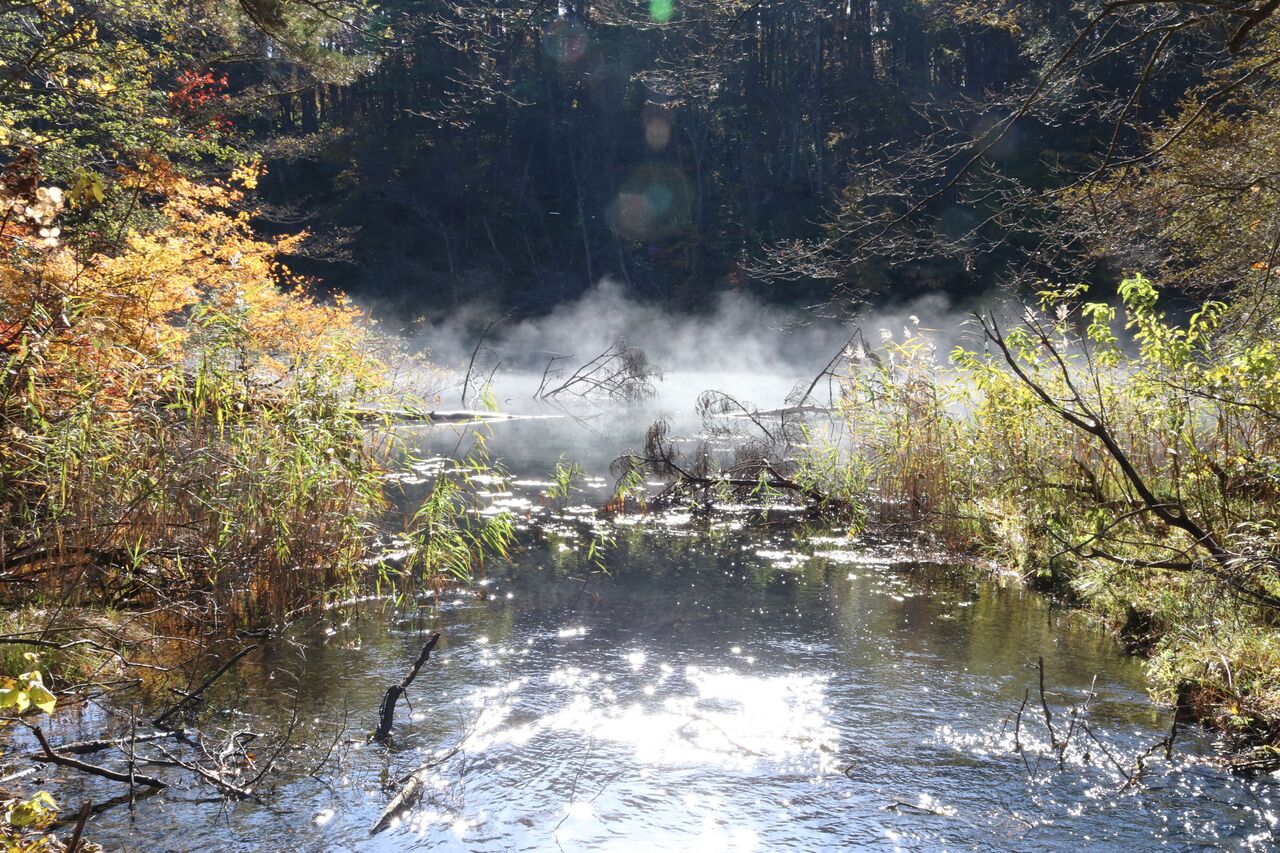 柳沼と探勝路を挟んで反対側には母沼があります。何故か、探勝路のマップには出ていませんでした。木に邪魔されてあまりよく沼は見えませんが、紅葉と共にきれいな水面が垣間見えました。