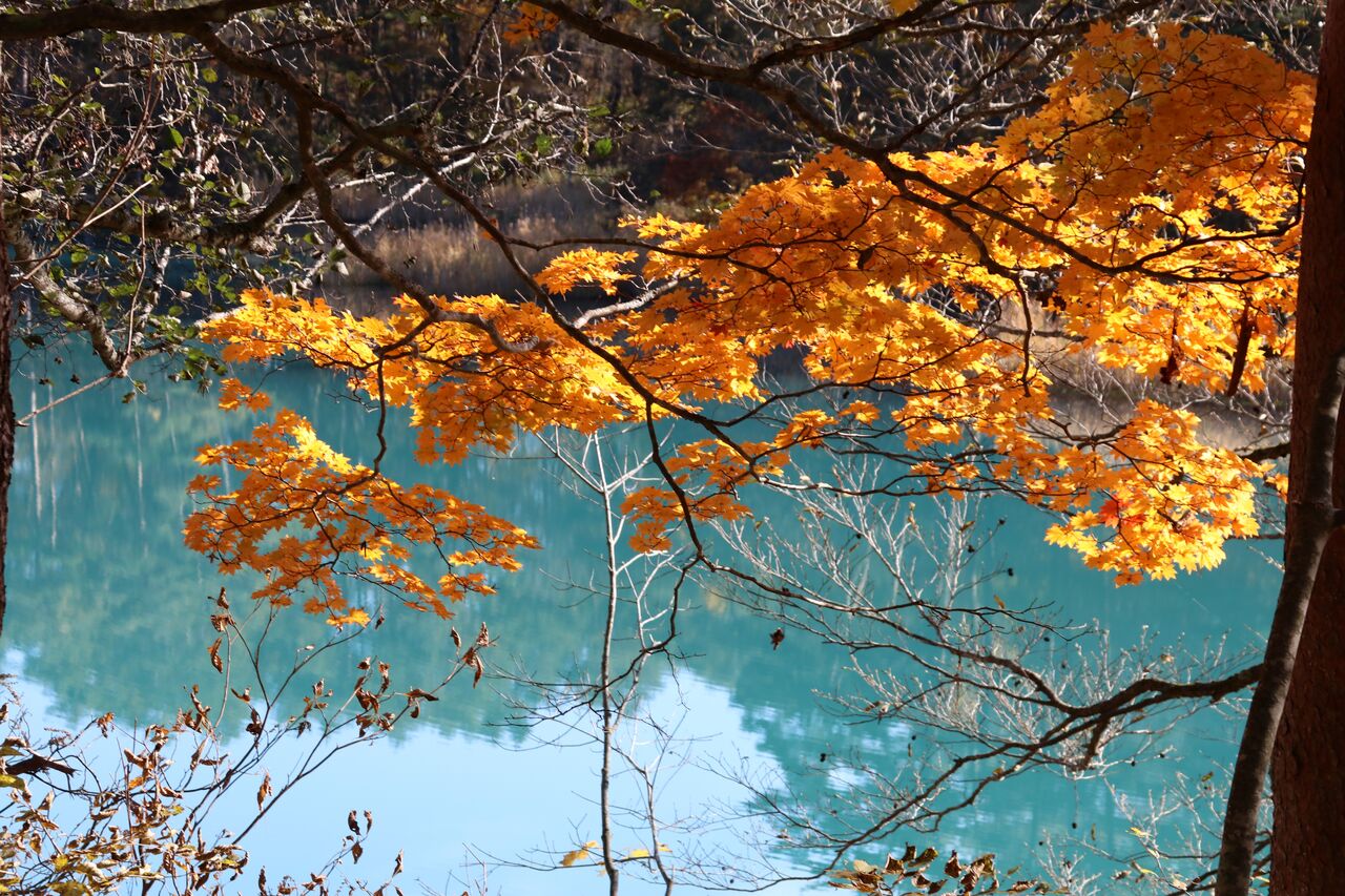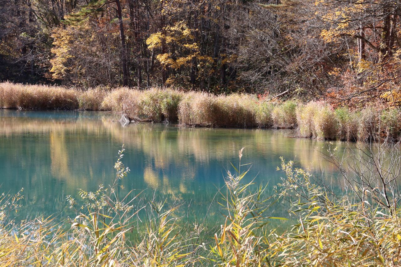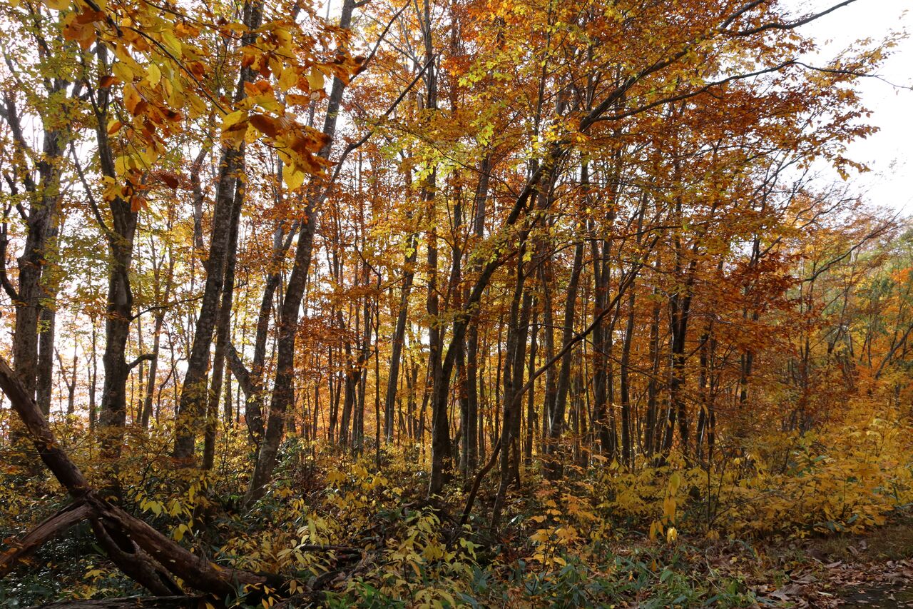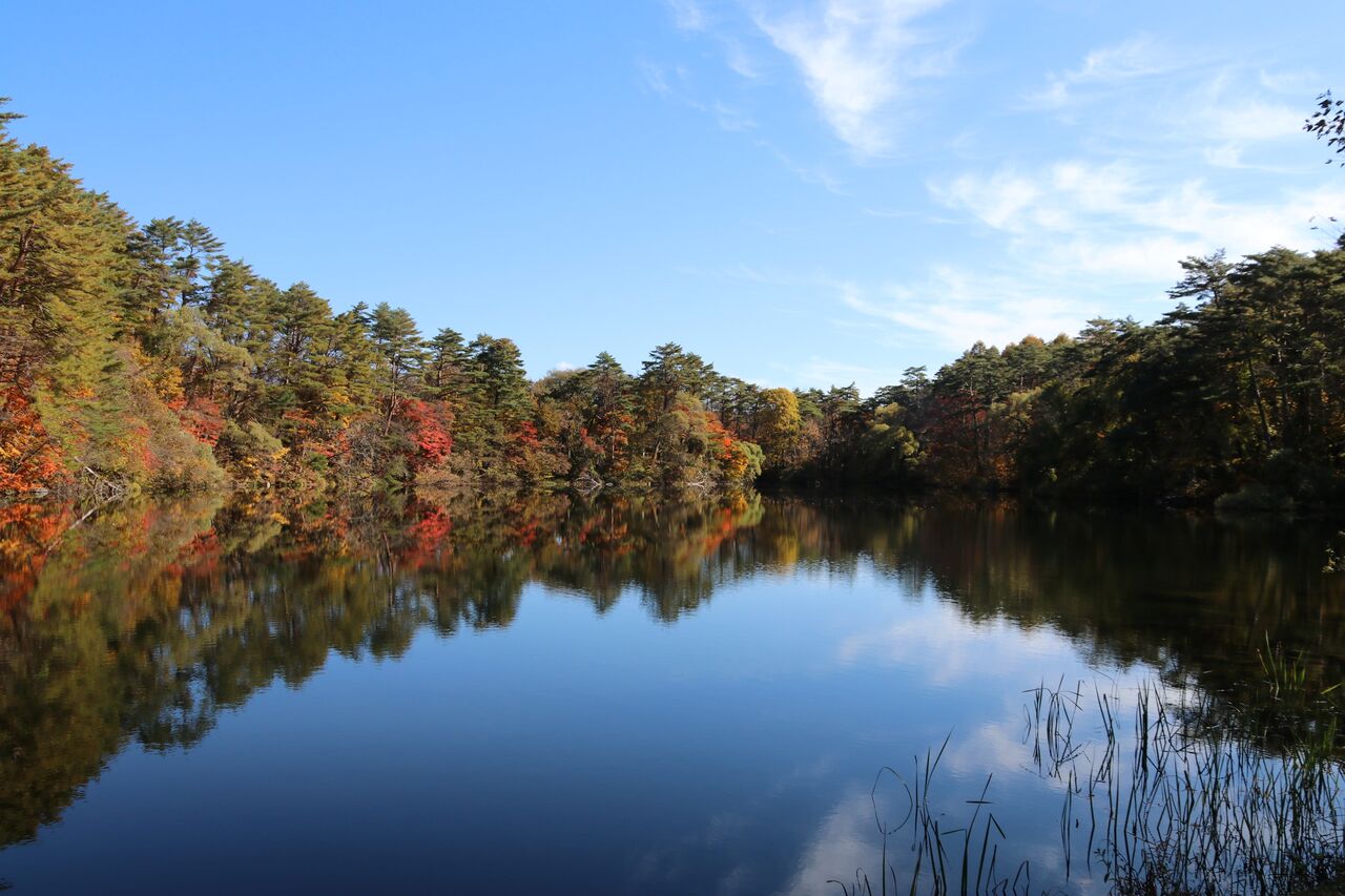 柳沼と探勝路を挟んで反対側には母沼があります。何故か、探勝路のマップには出ていませんでした。木に邪魔されてあまりよく沼は見えませんが、紅葉と共にきれいな水面が垣間見えました。