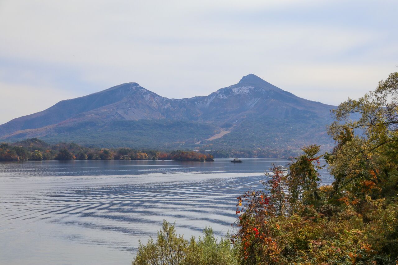 ここから再び檜原湖に向かいます。檜原湖の磐梯山展望所です(map⑤)。車を停められる展望所になっていますが。そこからは磐梯山は少ししか見えません。道路を少し北に歩くと磐梯山全体を見ることができます。