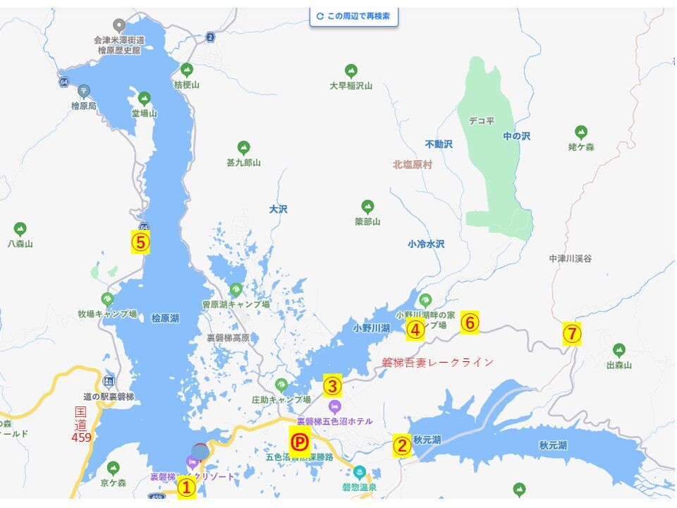 五色沼散策の後、裏磐梯三湖巡りをしました。mapを見ながら右往左往しました。