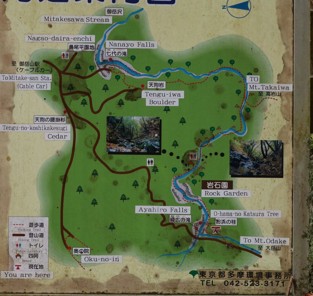 本来なら、上の地図の上部から沢におりて沢沿いに登ってくるというコースですが、私は沢の左にある斜めに伸びる茶色の路を歩き、本来のゴール地点(地図下)からロックガーデンに入ったわけです。結局、さっき分岐点に書いてあった「険しい道」というのを逆に歩くことになりました。