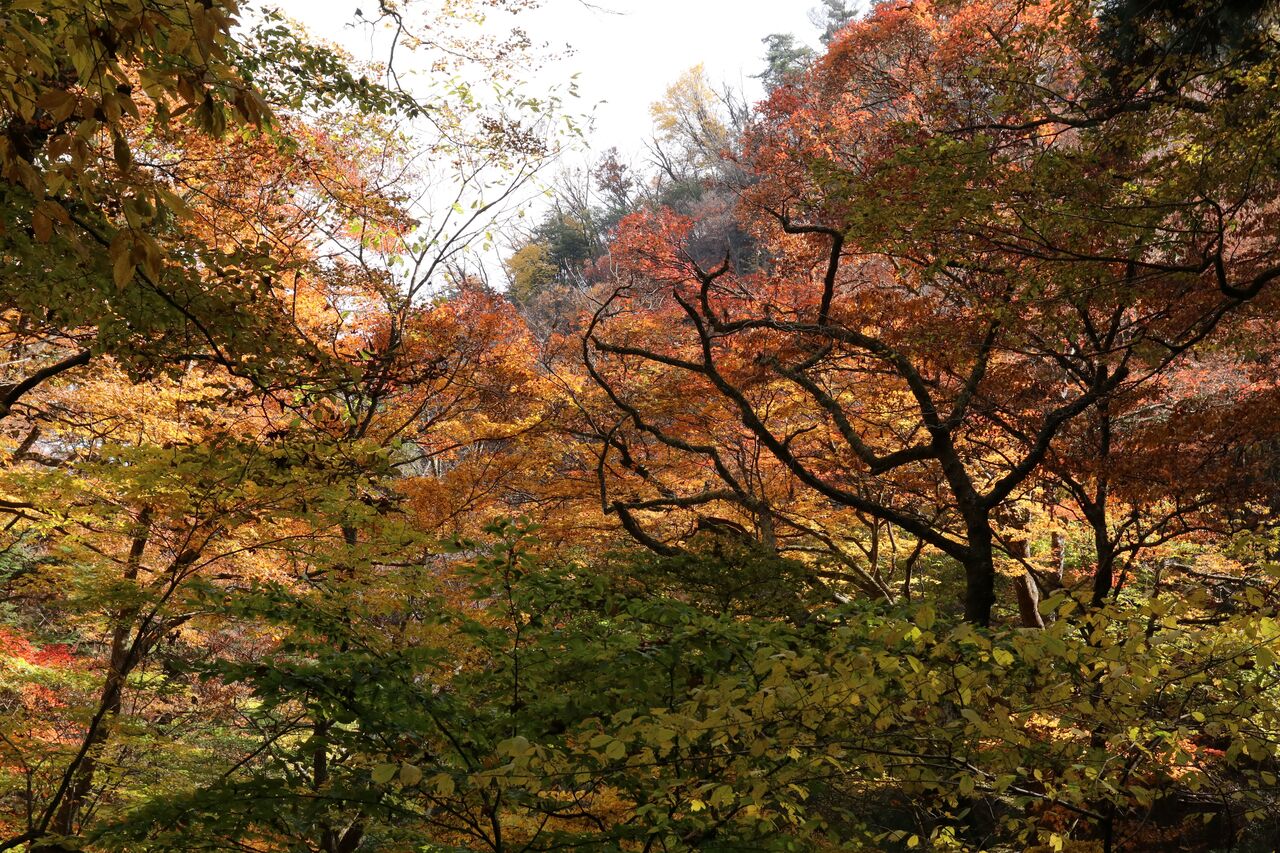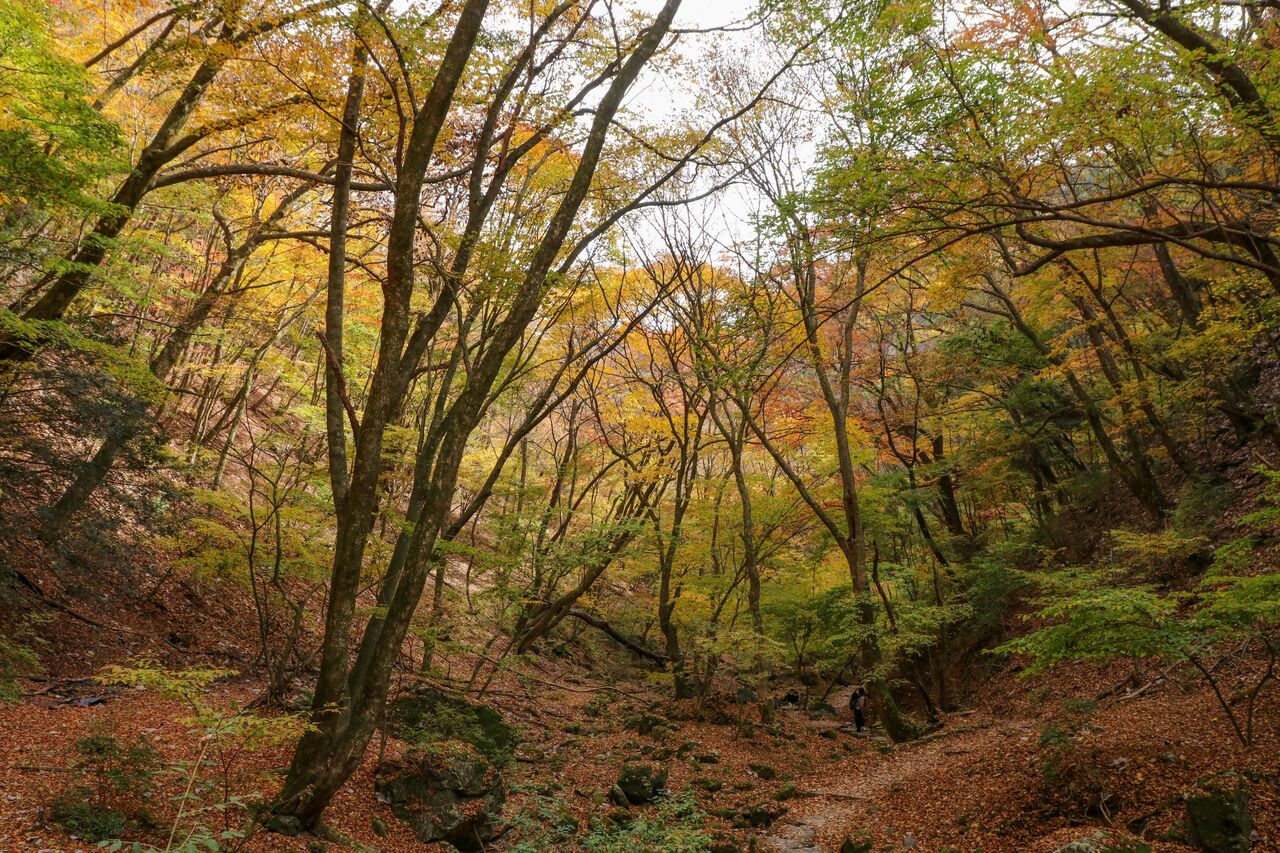 ↓この辺は紅葉より黄葉が多いです。まだ黄色になりかけで薄い緑になっているので新緑のようにも見えます。