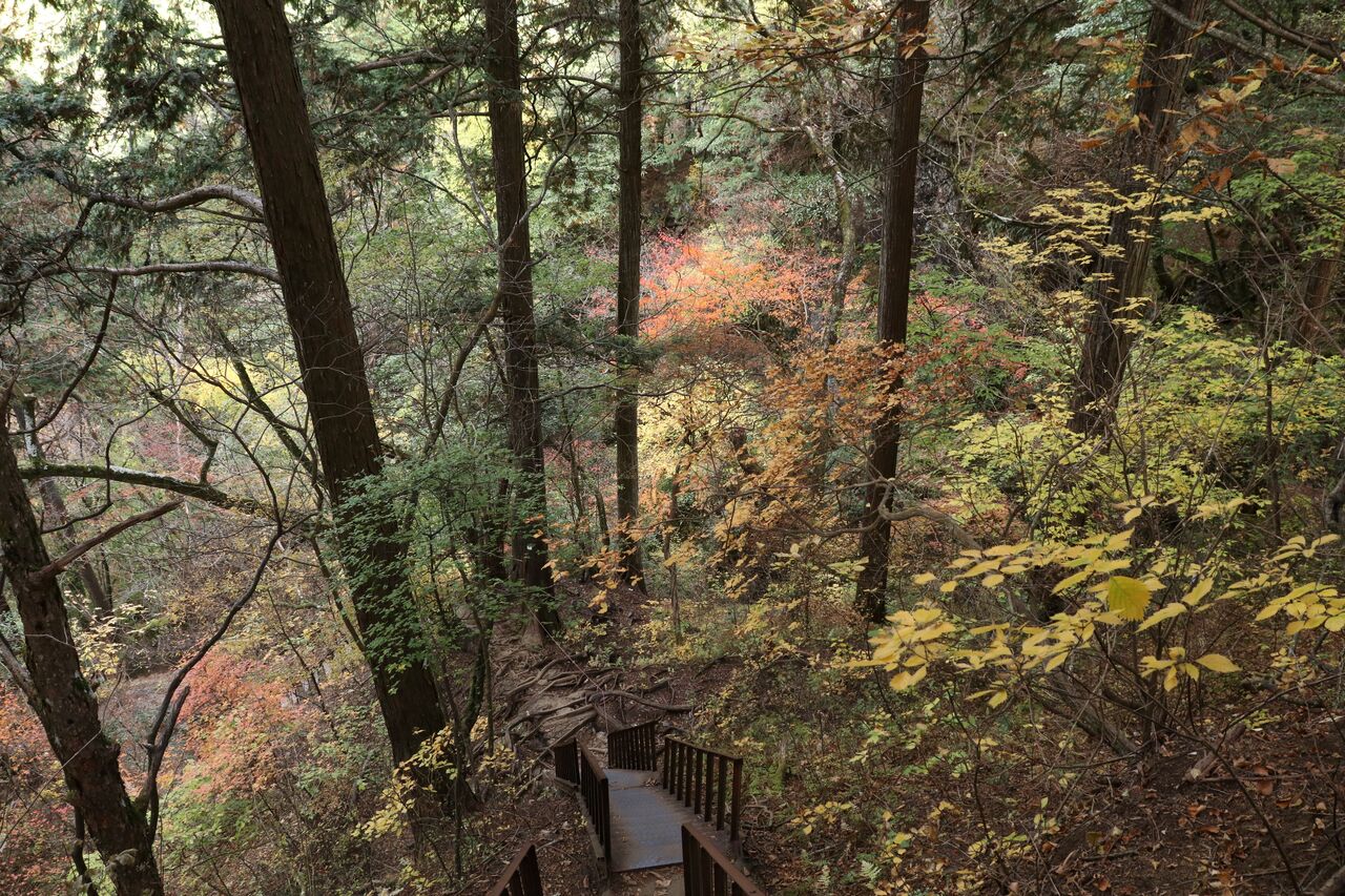 少しすると、七代の滝への分岐がありました。やはり「この先急な坂が続きます」と書いてあります。見たところ、確かに急峻ですが・・・