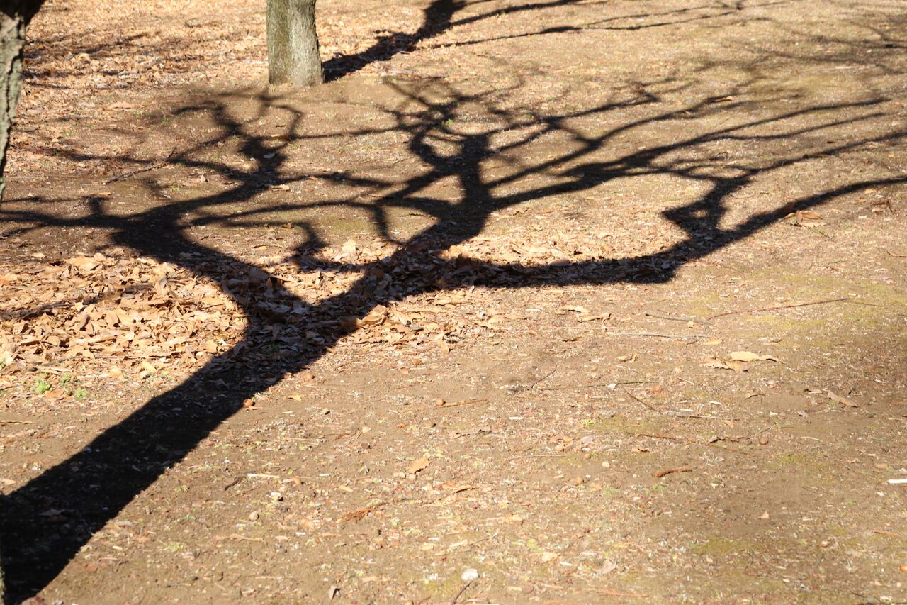 冬、午後になるとぐっと日が傾きます。桜の木の影が芝生に模様を描いていました。